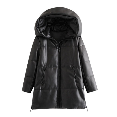 BBWM Women 2020 Winter Fashion Thick Warm Faux Leather Parkas Vintage Hooded Long Sleeve Padded Jacket Female Chic Overcoat