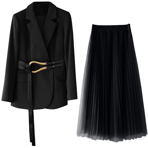 2021 Plus Size Women's Suit Blazer Dress Long Jacket Mesh Dresses Two Piece Set With Belt Elegant Women Winter Coat Dress Sets